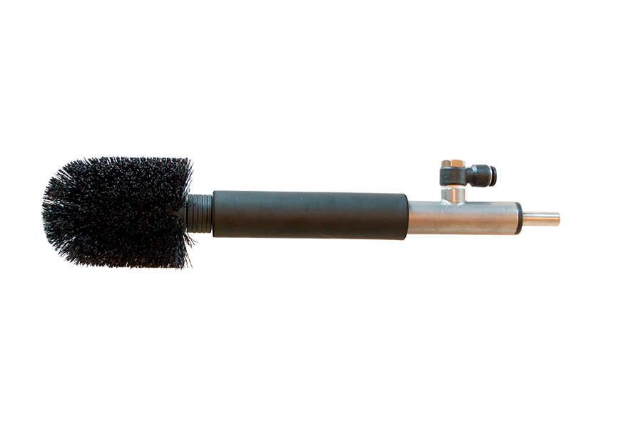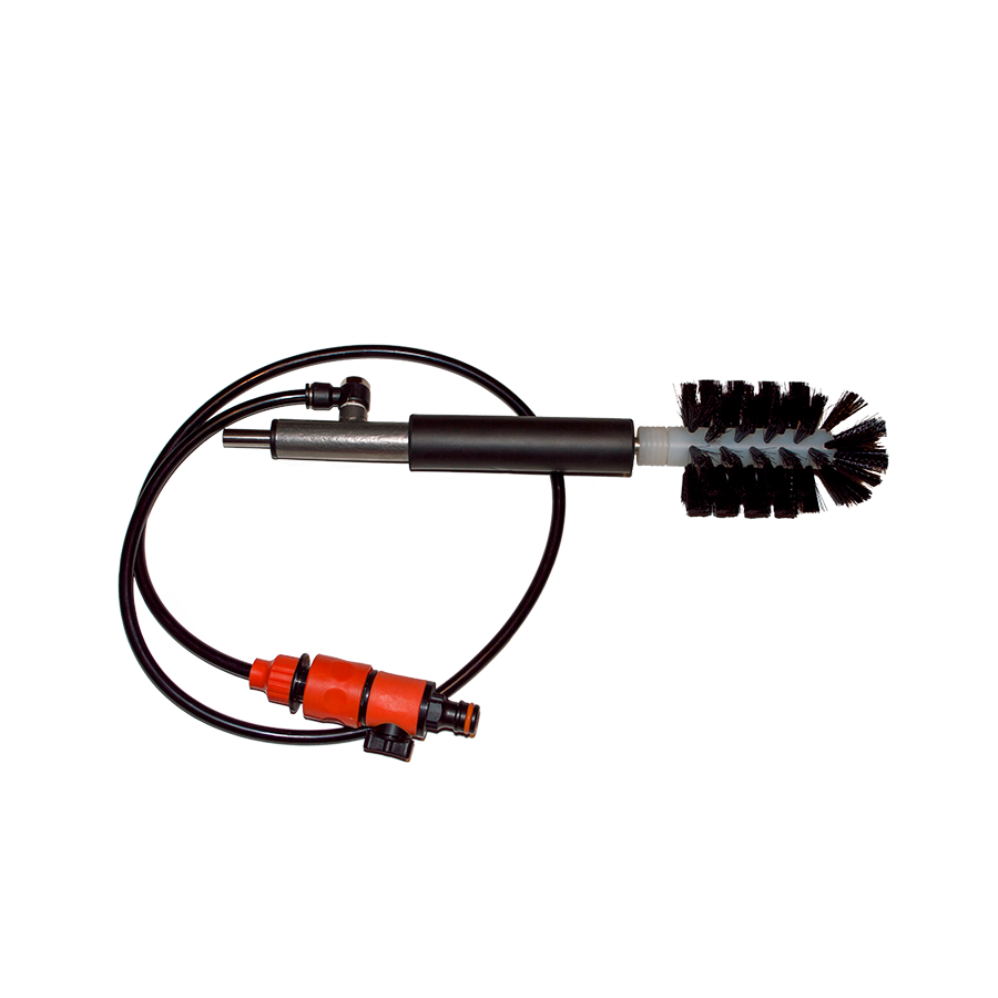 Mellemstykket , med det sorte gummi håndtag er der hvor vandet sendes igennem, ud til børsten. Det er beregnet til at den ene hånd placeres på håndtaget og dermed kan børsten styres helt optimalt. Den anden ende er beregnet til montering i din batteriboremaskine. Lige efter monteringen til batteriboremaskinen, sidder der en 8mm lynkobling til den 8mm vandslange.