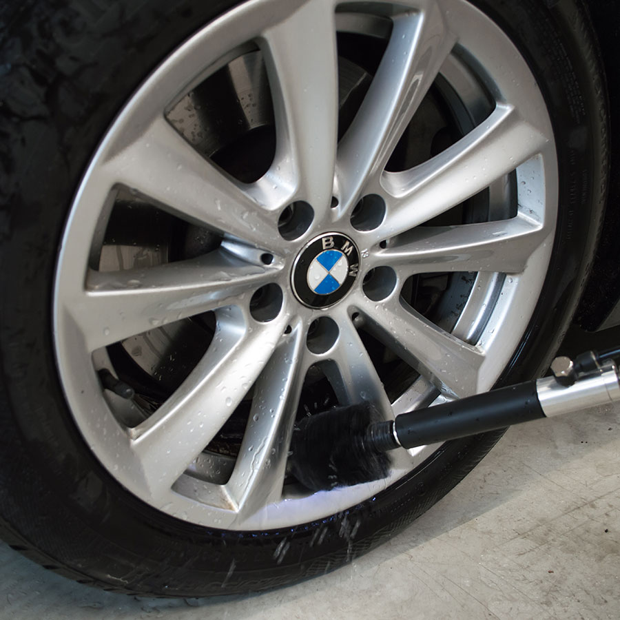 Børsten er beregnet til at rengøre bil fælge med og ved at vi har vandet helt ude i børsten, gør at du ikke behøves at smøre dine fælge ind i fælgrens eller sæbe først.